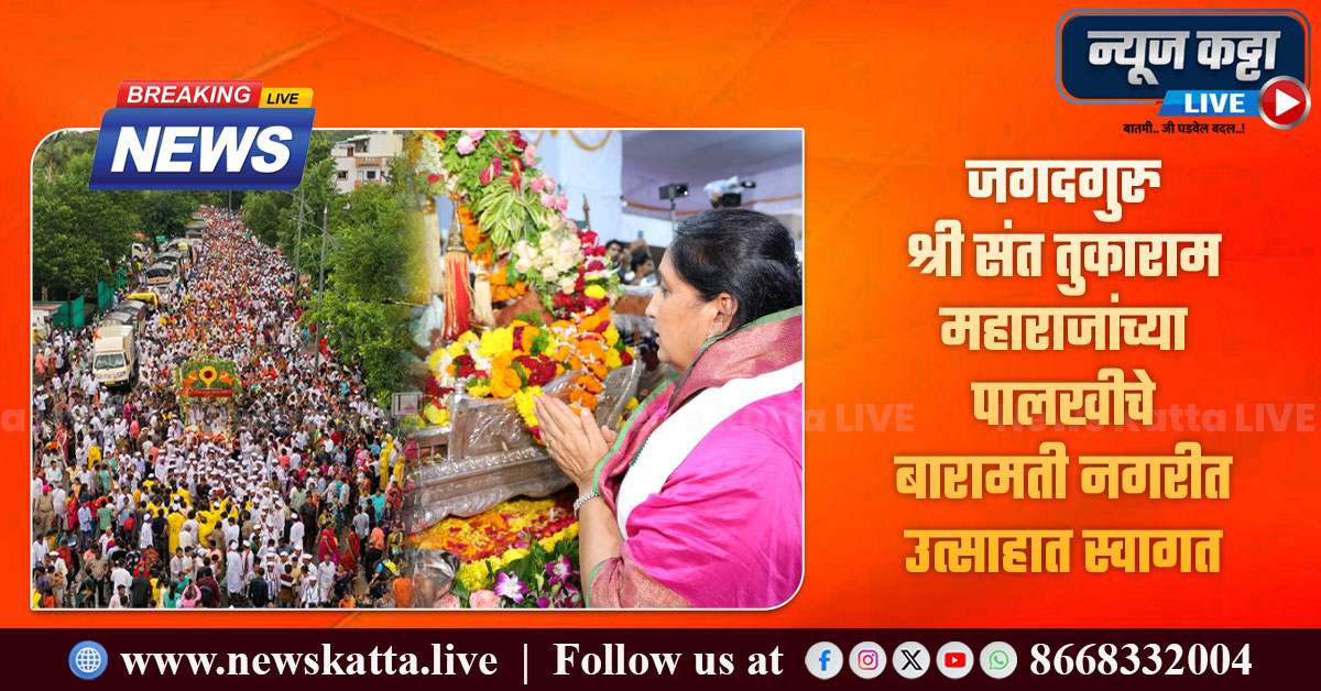 जगद्गुरू श्री संत तुकाराम महाराजांच्या पालखीचे आज बारामती शहरामध्ये ‘ज्ञानोबा माऊली तुकाराम..ज्ञानोबा माऊली तुकाराम… च्या गजरात आणि भक्तिमय वातावरणात आगमन झाले. पाटस रोडवरील देशमुख चौकात प्रशासनासह विविध सामाजिक संस्थांच्या वतीने पालखी रथ आणि दिंड्यांचे स्वागत करण्यात आले.