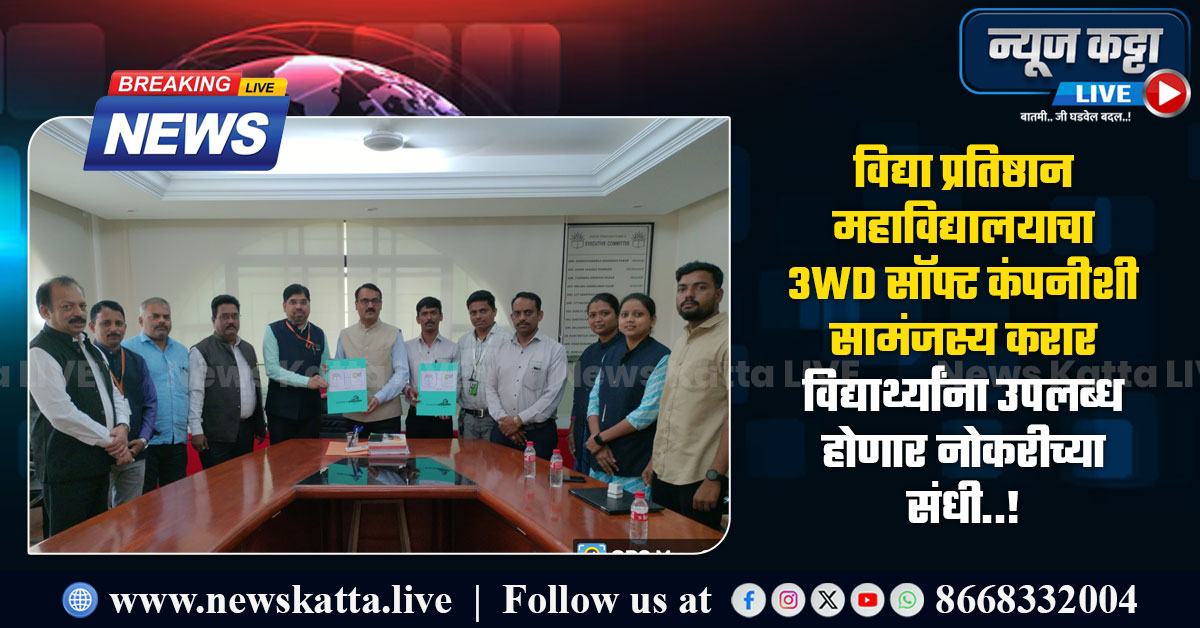 बारामती : न्यूज कट्टा बारामती येथील विद्या प्रतिष्ठान कला,विज्ञान व वाणिज्य महाविद्यालयाने 3WD सॉफ्ट या नामांकित कंपनीशी सामंजस्य करार केला आहे. महाविद्यालयाच्या बीबीए (सीए), बीएससी