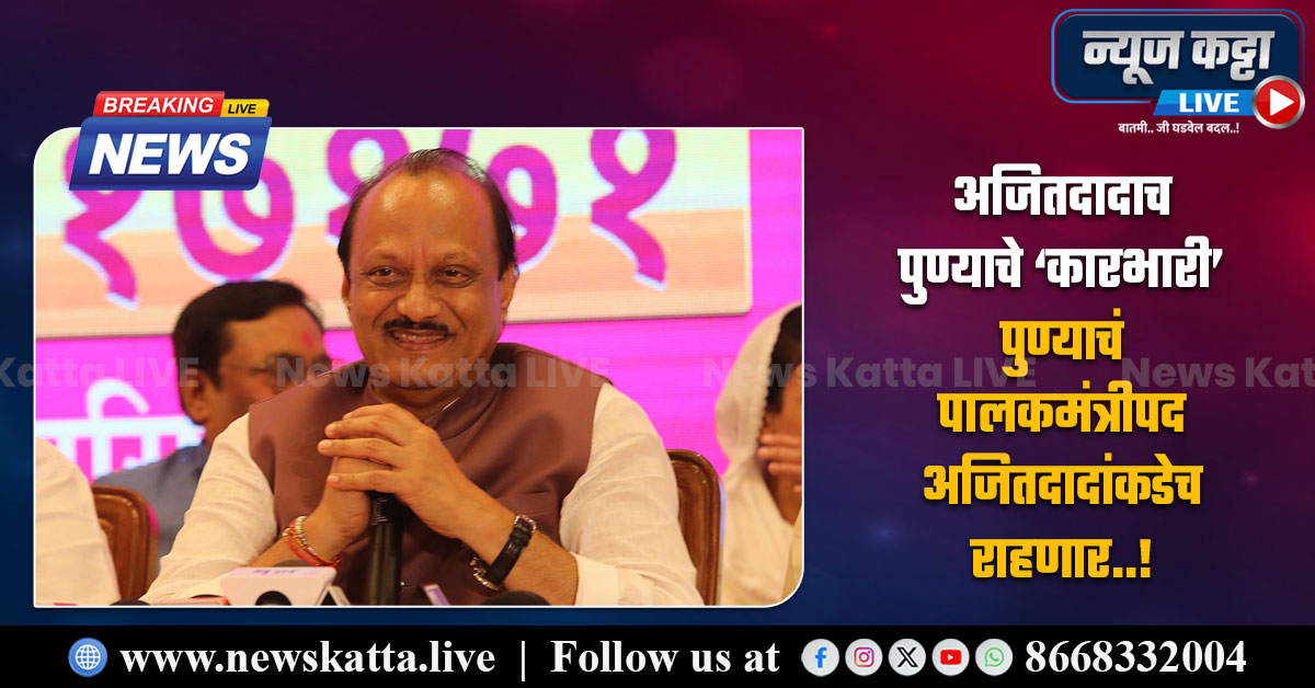 महायुती सरकार स्थापन झाल्यानंतर पुण्याचं पालकमंत्रीपद कुणाला मिळणार याबाबत गेले काही दिवस चर्चा रंगल्या होत्या. आता पुण्याचे पालकमंत्री हे उपमुख्यमंत्री अजित पवार यांच्याकडेच राहणार असल्याची माहिती विश्वसनीय सूत्रांनी दिली आहे. त्यामुळं अजितदादाच पुण्याचे कारभारी असतील यावर शिक्कामोर्तब झालं आहे.
