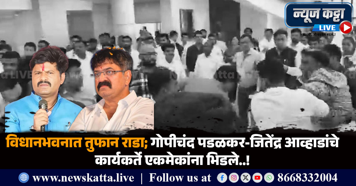 मागील काही दिवसांपासून भाजपाचे आमदार गोपीचंद पडळकर आणि राष्ट्रवादी काँग्रेस शरदचंद्र पवार गटाचे आमदार जितेंद्र आव्हाड यांच्यात वाकयुद्ध सुरु आहे. आज याची परिणीती थेट विधानभवनाच्या लॉबीत मारहाण करण्यापर्यंत पोहोचल्याचं पहायला मिळालं. त्यामुळं एकच खळबळ उडाली आहे. याबाबत मिळालेली माहिती अशी की, आज सायंकाळच्या सुमारास आव्हाड आणि पडळकर यांचे कार्यकर्ते थेट विधानभवनाच्या लॉबीतच एकमेकांना भिडले. एकमेकांना धक्काबुकी करत त्यांनी अश्लील शिवीगाळ केली. यावेळी त्या ठिकाणी उपस्थित असलेल्या सुरक्षारक्षकांनी पुढे होत या कार्यकर्त्यांचा राडा शांत केला.