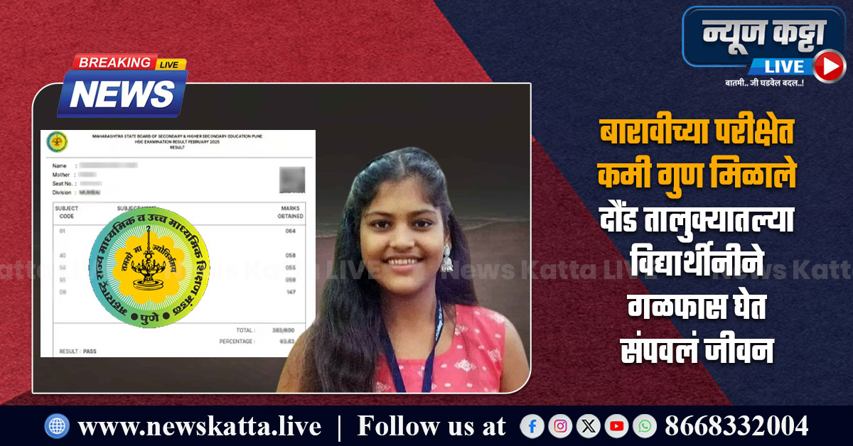 DAUND BREAKING : बारावीच्या परीक्षेत कमी गुण मिळाले; दौंड तालुक्यातल्या विद्यार्थीनीने गळफास घेत संपवलं जीवन